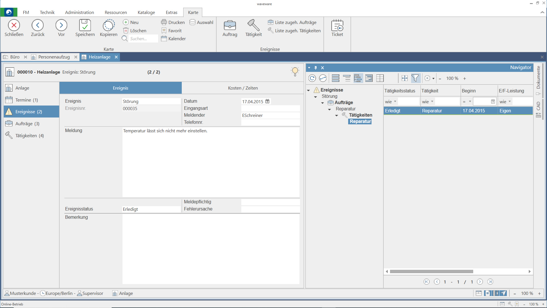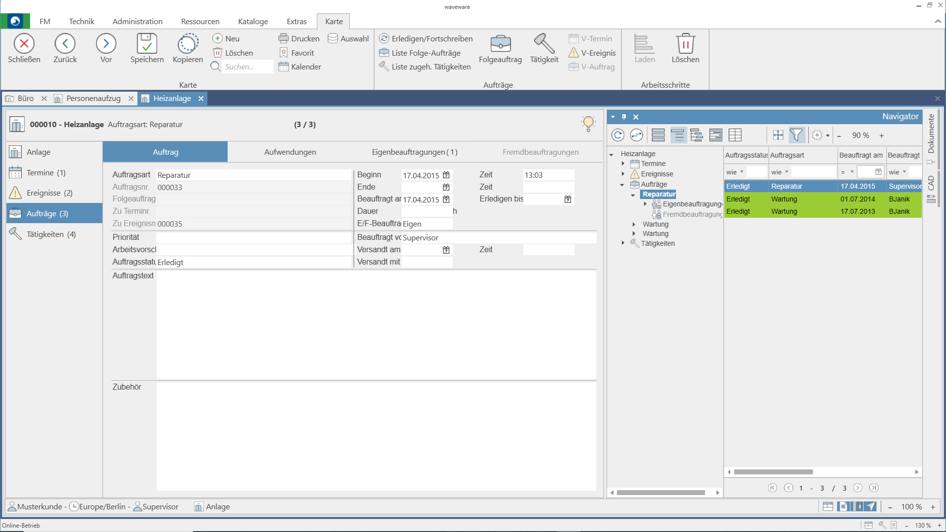 Der Navigator bildet die Schaltzentrale Ihrer Softwarelösung. Er stellt Strukturen, Zusammenhänge und Hierarchien unterschiedlicher Objekte übersichtlich dar und ermöglicht einen direkten und schnellen Zugriff auf gewünschte Datensätze. Der Navigator stellt für die Darstellung vorhandener Datenstrukturen unterschiedliche Modi bzw. Ansichten zur Verfügung. Damit besitzen Anwender zu jeder Zeit einen Überblick und navigieren mühelos durch Datenstrukturen von Dokumenten, Aufträgen, Leistungen, Personal, FM-Objekten, Tickets, Projekten und vielen weiteren.