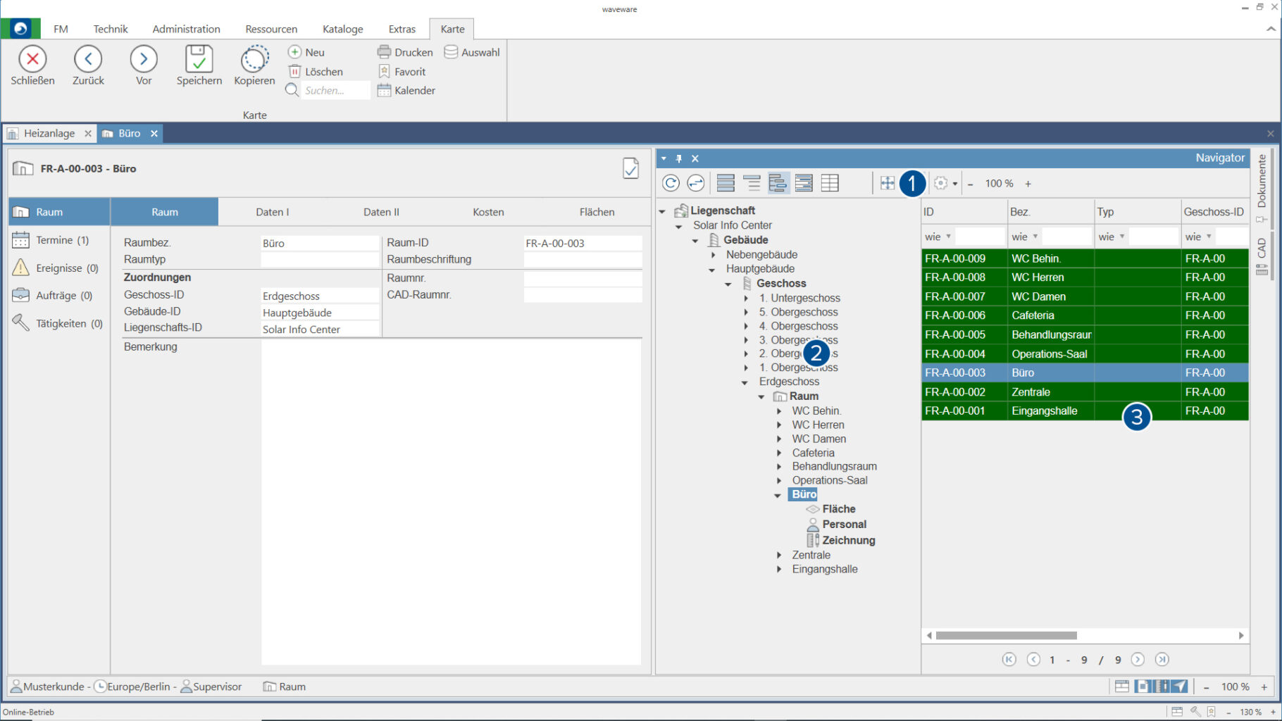 Der Navigator ist ein in waveware® standardmäßig integriertes Werkzeug, um beispielsweise CAFM-Daten in wave Facilities anzuzeigen und für Anwender zugänglich zu machen. Wie das DMS (Dokumentenmanagement) wird auch der Navigator in einem eigenen Fenster angezeigt. Die Positionierung des Tools kann innerhalb der Software-Oberfläche frei gewählt werden. Der Navigator ist in drei Bereiche aufgeteilt. Im Kopfbereich lassen sich über eine Symbolleiste verschiedene Ansichten auswählen. Im Hauptfenster unterteilt sich der Navigator in eine Baumansicht und eine Tabellenansicht. Während in der Baumansicht die hierarchischen Zusammenhänge eines Objekts dargestellt werden, gibt die Tabellenansicht Inhalte des Objektdatensatzes wieder.