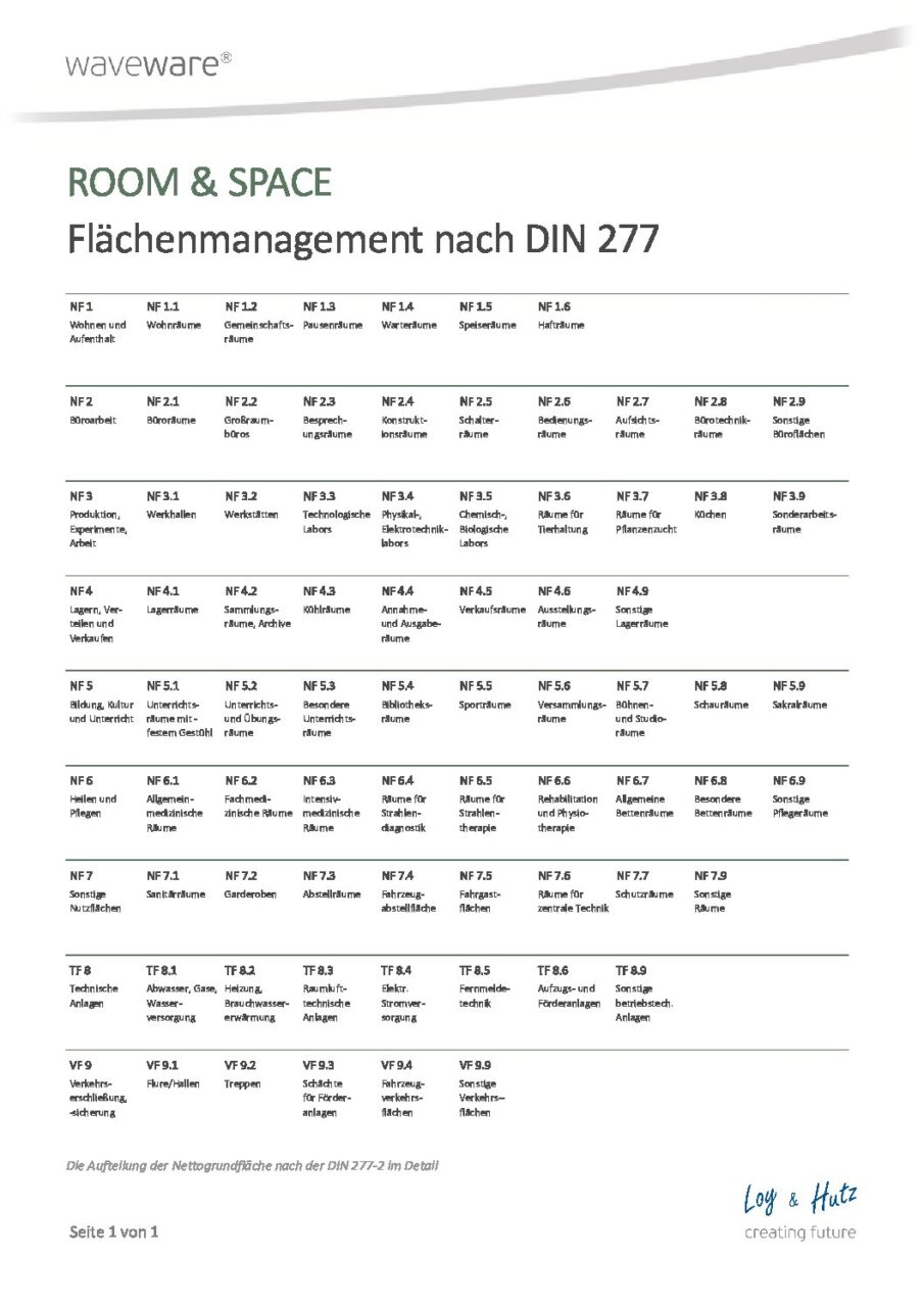 Die DIN 277 (Ausgabe 2021-08) bietet einen Standard für die einheitliche Ermittlung und Kategorisierung von Flächen und Räumen. Neben der Erfüllung der DIN 277 beinhaltet das Flächenmanagement ROOM & SPACE eine Reihe von Leistungen des Infrastrukturellen Facility Managements (IFM). Über das integrierte Raumbuch werden alle notwendigen Attribute zum Raum und dessen Inventar erfasst.