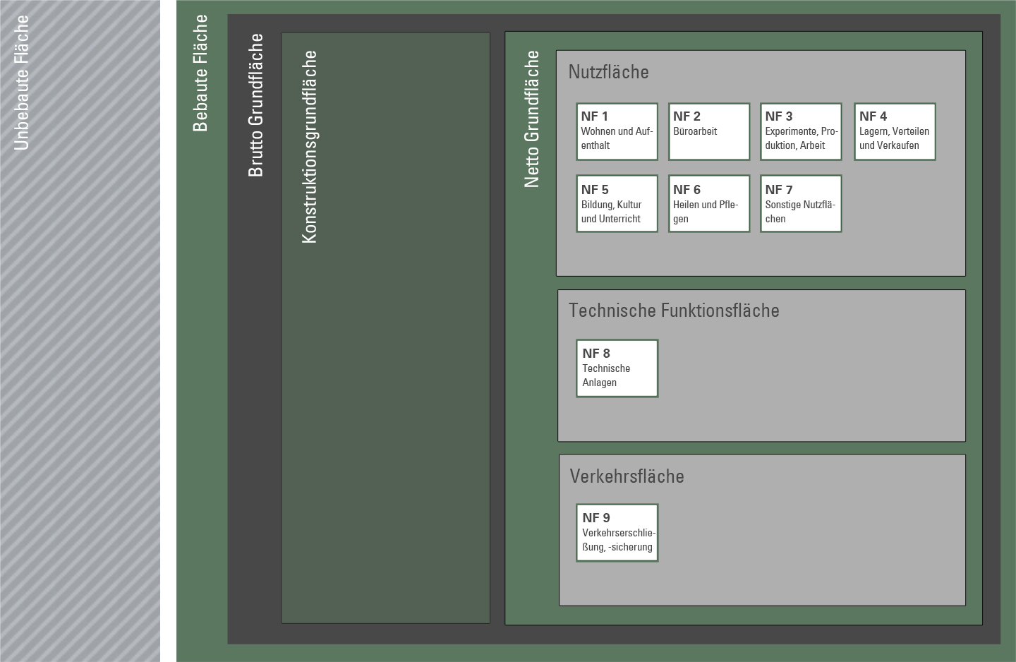 Die Netto-Raumfläche (NRF) unterteilt sich in Nutzungsfläche (NUF), Technikfläche (TF) und Verkehrsfläche (VF). Während die Technikfläche (TF) alle Grundflächen einschließt, auf denen die technischen Anlagen zur Versorgung und Entsorgung des Bauwerks untergebracht sind, enthält die Verkehrsfläche (VF) alle dem Grundstück zugehörigen Flächen, die das Bauwerk erschließen (z.B. Fahrbahnen, Rampen, Rangierflächen).