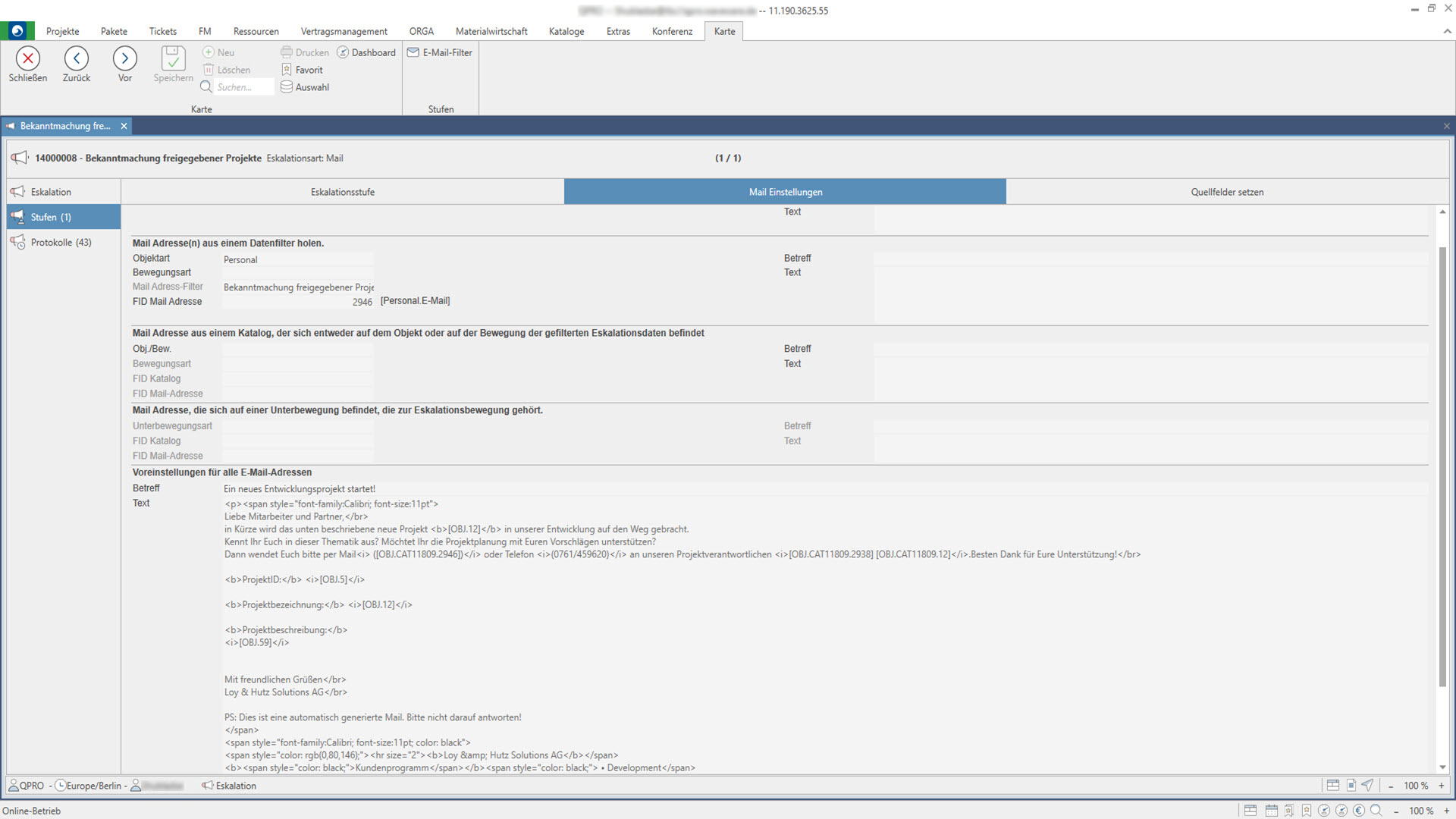 Konfiguration einer Eskalation für die Nutzung des Ticketmanagements.