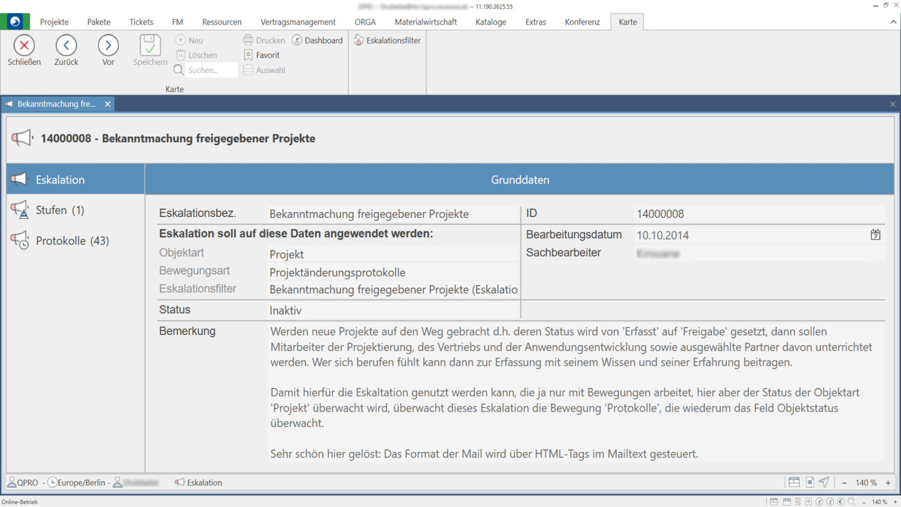 Das Eskalationsmanagement ESCALATION behält für Sie alle Termine im Blick, überwacht relevante Prozesse, leitet auf Wunsch selbstständig notwendige Maßnahmen ein und informiert Sie, falls erforderlich. Verpassen Sie nie wieder Termine oder kritische Entwicklungen dank der individuellen Einstellungsmöglichkeiten des Eskalationsmanagements. Diese lassen sich schnell und einfach auf Ihre Bedürfnisse anpassen. Für die Konfiguration des Eskalationsmanagements ist keine Programmierung nötig.