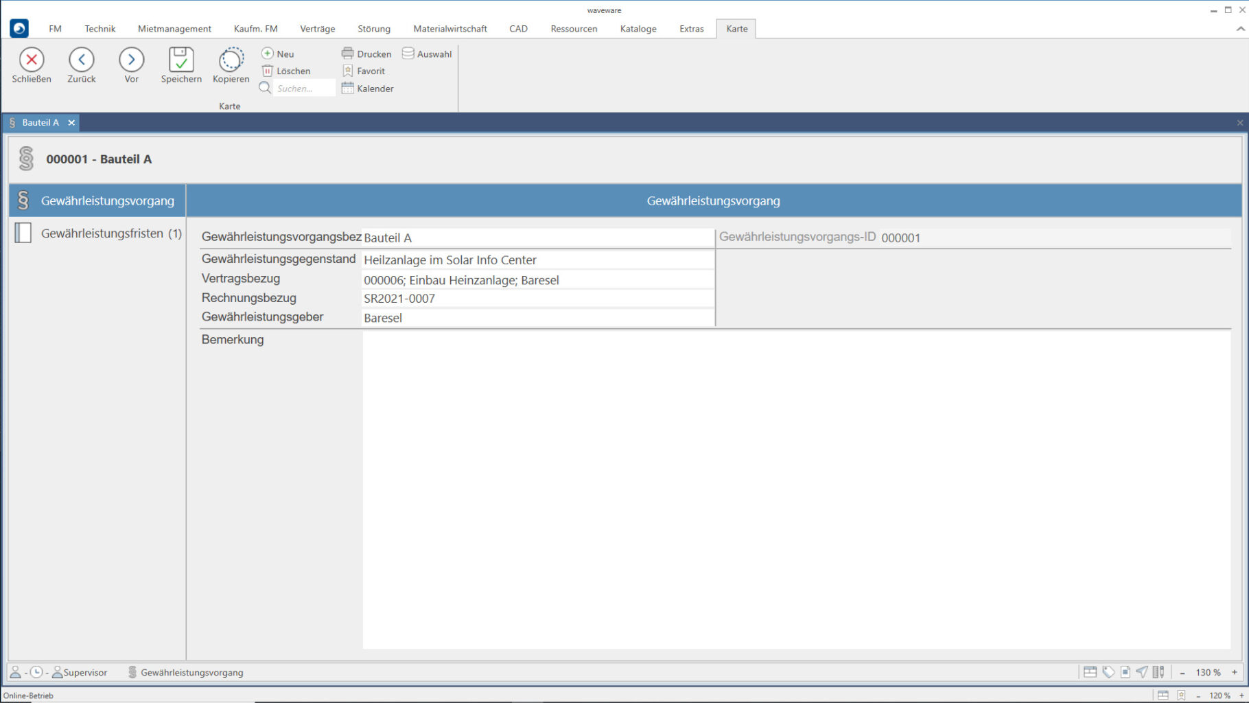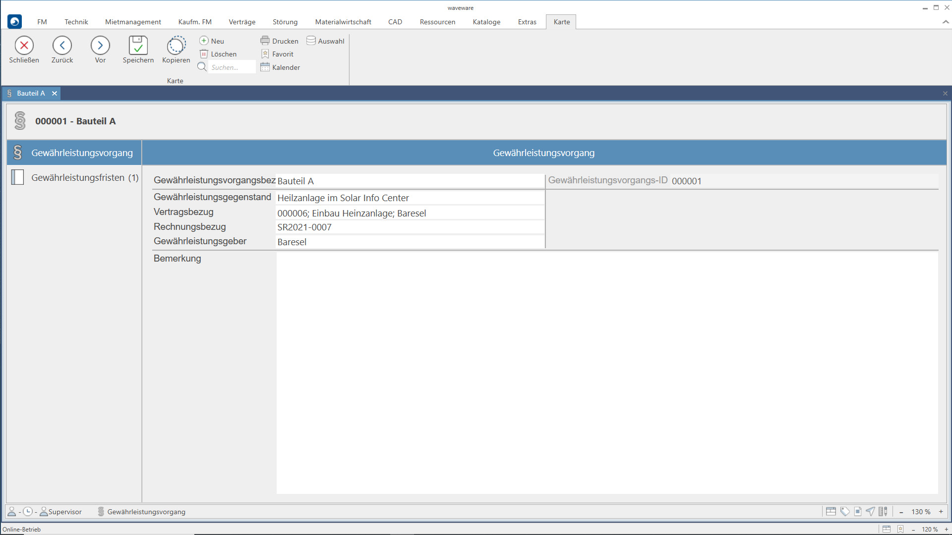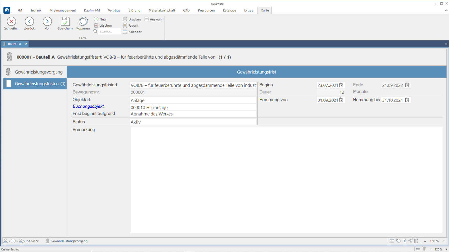 Die vordefinierte Eingabemaske enthält alle zur vollständigen Dokumentation erforderlichen Eingabefelder. Katalogfelder ermöglichen eine konsistente Erfassung von Bezeichnungen, sodass ein einheitlicher Wortlaut in der Gewährleistungsmanagement-Software sichergestellt wird. Zu einem Gewährleistungsvorgang können beliebig viele Gewährleistungsfristen erfasst werden. Als Gewährleistungsfristen werden in waveware® die Verjährungsfristen gemäß BGB und VOB bezeichnet. Die gesetzlichen Verjährungsfristen können bei Bedarf um individuelle Garantiefristen erweitert werden. Jede Gewährleistungsfrist enthält den Verjährungsbeginn (Abnahmetermin), das Verjährungsende und die Verjährungsdauer. Darüber hinaus kann ein definiertes Objekt des Gebäudemanagements wie zum Beispiel ein Gebäude oder eine Anlage zugeordnet werden.