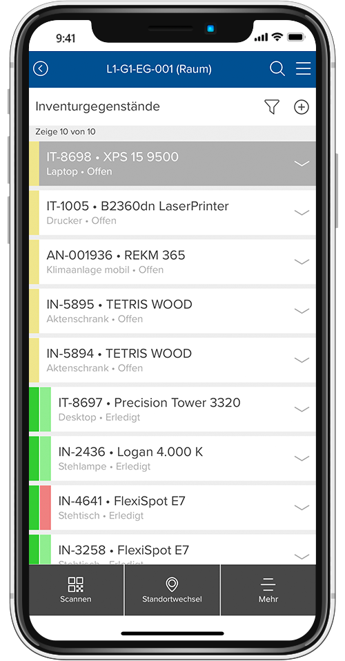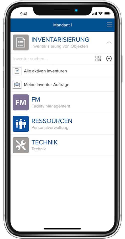 Nachdem Ihre Bestandsliste mit zu erfassenden Facilities und Objekten, wie Anlagen, Geräte, Büroeinrichtungen, IT und Artikel, erstellt wurde, erscheint diese auf dem gewünschten mobilen Endgerät. Die Inventursoftware unterstützt die bearbeitende Person bei der schnellen Datenerfassung. Hierzu ermöglicht die Inventur-App das Scannen von Bar- und QR-Codes, die beispielsweise an Türschildern oder direkt auf den jeweiligen Objekten angebracht wurden. Das Resultat ist eine effiziente Inventur ohne Medienbruch. Im Folgenden zeigen wir Ihnen den einfachen Ablauf der mobilen Inventur.