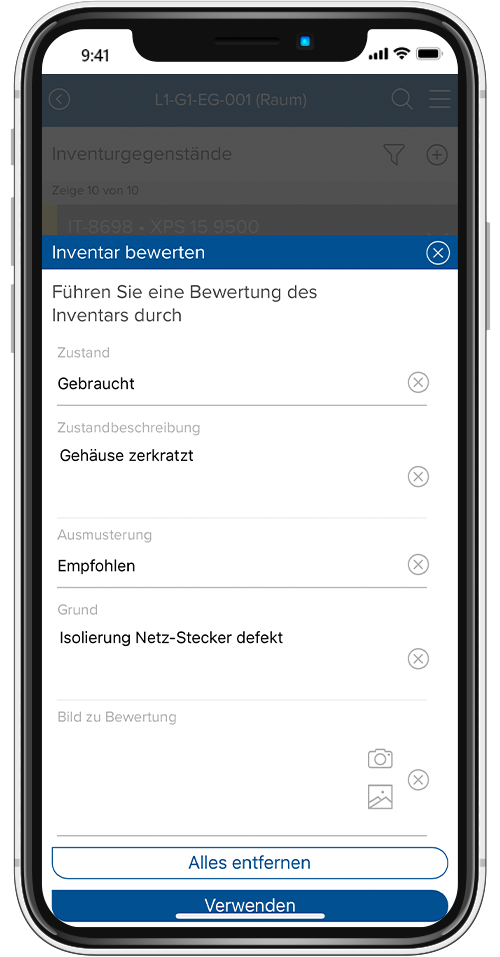 Beschädigte oder defekte Objekte können zur Ausmusterung markiert und ein Schadensfoto im Dokumentenmanagementsystem (DMS) hinterlegt werden.