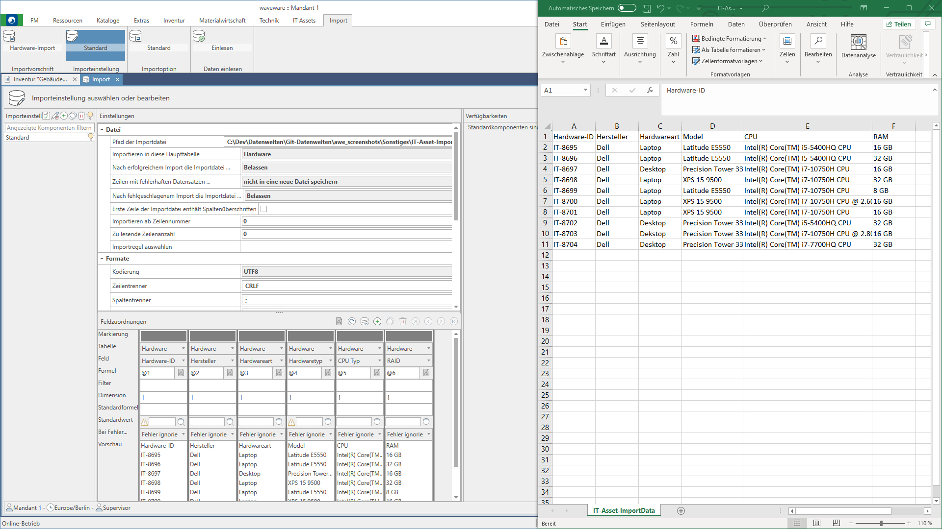 Mit dem komfortablen und äußerst flexiblen waveware® Importmodul importieren Sie bequem alle Daten Ihrer Facilities und Objekte wie Anlagen, Gegenstände, Artikel etc. Sollten Ihre Daten keine Standort- bzw. Rauminformationen enthalten, können Sie diese nach dem Import durch eine Datenerfassung „vor Ort“ manuell oder mittels Bar-/QR-Code vervollständigen.