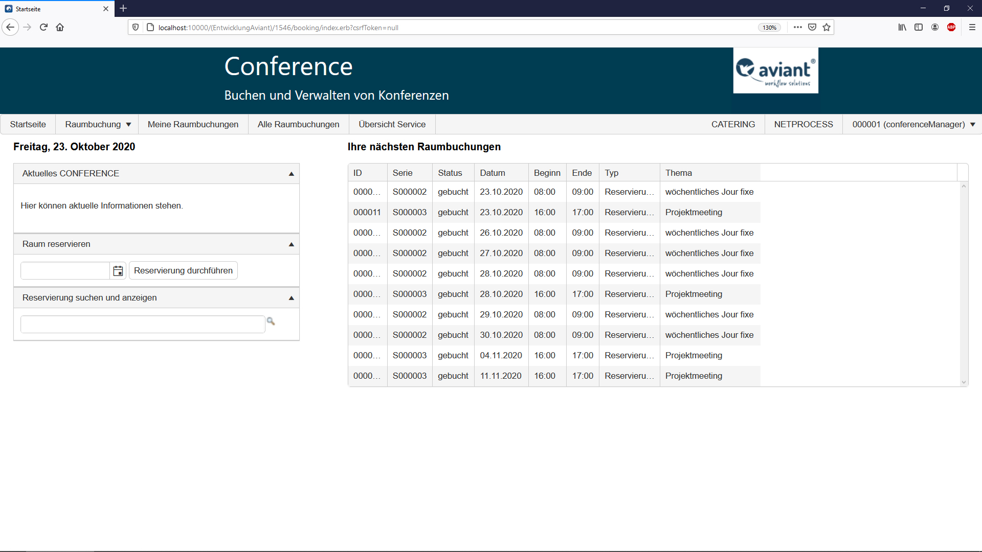 Mit CONFERENCE können Anwender an zentraler Stelle, wie dem unternehmenseigenen Intranet, Besprechungsräume und Konferenzräume per Webbrowser reservieren. Die Konferenzraumverwaltung kann dabei auf Wunsch an die vorhandene Infrastruktur und Corporate Identity angepasst werden. Die Benutzeranmeldung lässt sich mit der Authentifizierung des Intranets koppeln und ermöglicht dadurch eine automatisierte Anmeldung. Mit dem Start des Reservierungs-Tools gelangt der Nutzer zunächst auf eine Übersichtsseite, welche alle bereits getätigten Raumbuchungen anzeigt. Mit vorhandener Reservierungs-ID kann nach einer bestimmten Raumreservierung gesucht werden. Ein Quick-Access ermöglicht zudem einen direkten Sprung in den Raumbuchungsprozess.