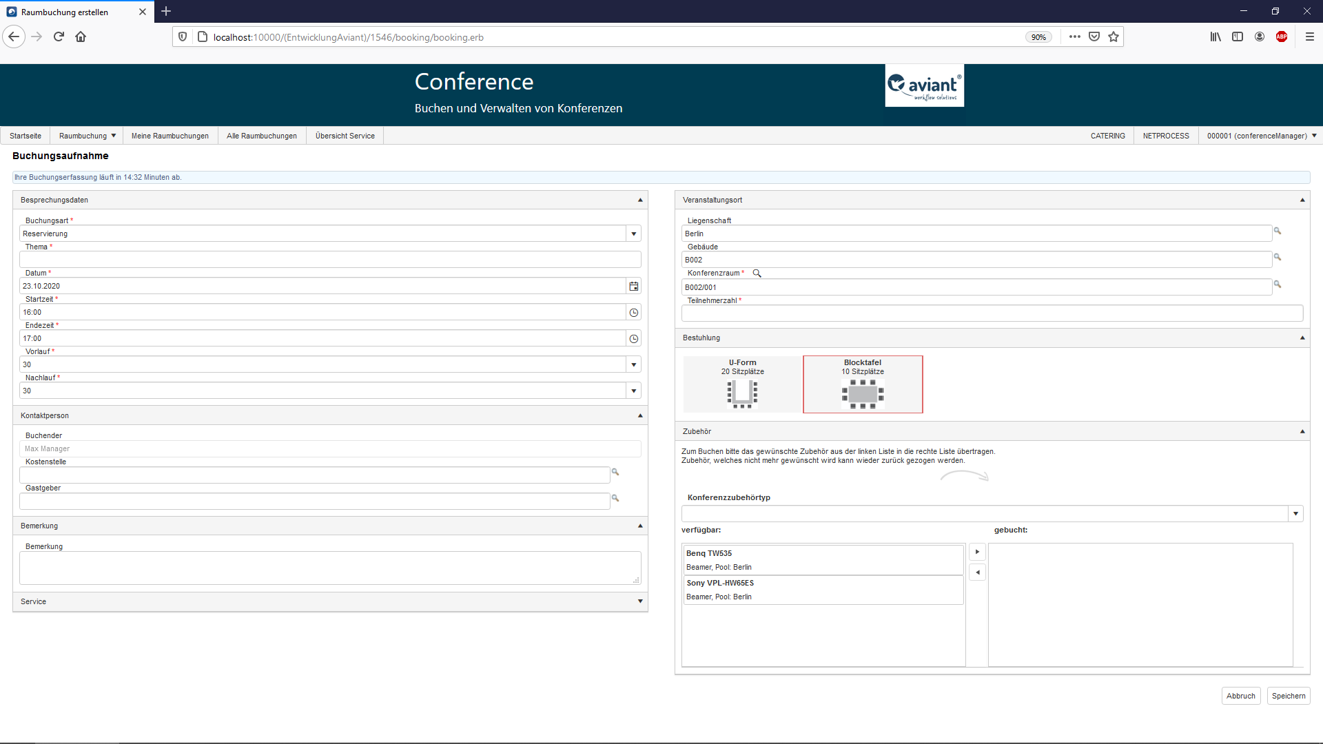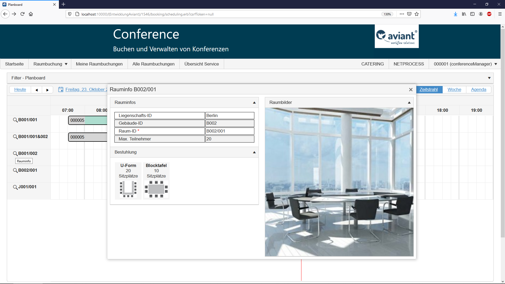 Einstellungen und die Pflege von Stammdaten werden über den waveware® FAT-Client im CONFERENCE-Paket vorgenommen. Administratoren können so Räume anlegen und beispielsweise Bestuhlungsvarianten definieren. Die eigentliche Buchung von Konferenz- und Besprechungsräumen erfolgt über die Nutzung des waveware® NETPROCESS-Clients. Dieser webbasierte ASP.NET-Client ermöglicht die leichtgängige und benutzerfreundliche Raumbuchung per Web. Über ein weiteres optionales Aufbaupaket können Administratoren Buchungen auch über die waveware® FAT-Client-Oberfläche vornehmen, in welcher die Webapplikation dann in vollem Umfang zur Verfügung steht. Weitere Features sind z.B. die Anzeige einer Buchungshistorie oder die Darstellung der E-Mail-Bodys im HTML-Format.