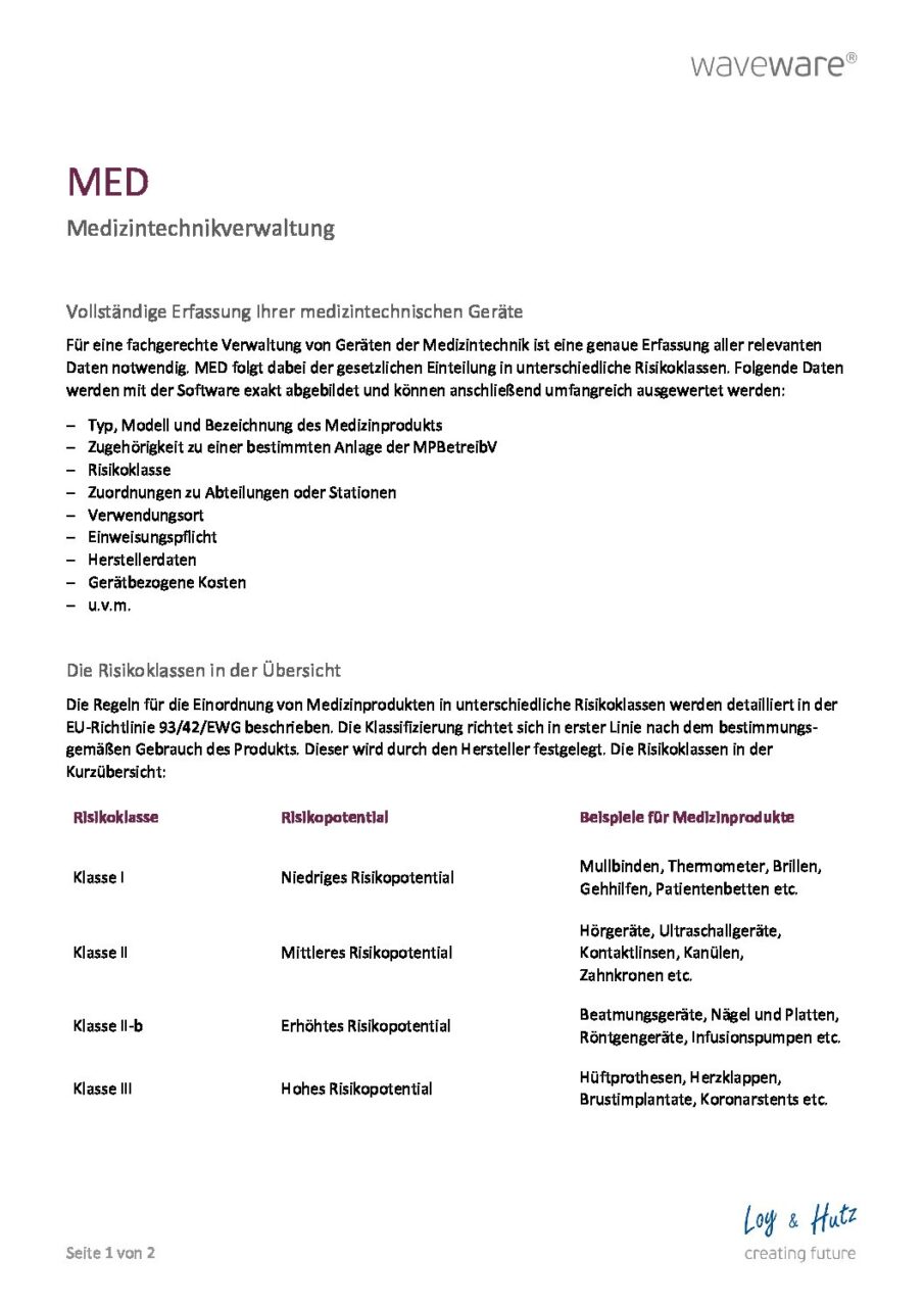 In Krankenhäusern, Praxen und Pflegeeinrichtungen kommt jeden Tag eine Vielzahl medizintechnischer Geräte zum Einsatz. Die komplexen Apparate werden von zahlreichen Personen gleichzeitig bedient und erfüllen dabei die unterschiedlichsten Anforderungen. Diese unzähligen Ansprüche führen dazu, dass Sie bei der Auswahl einer Verwaltungssoftware besonders viel Wert auf Flexibilität, Ergonomie und Sicherheit legen. Mit der Medizintechnikverwaltung MED erfüllen Sie nicht nur alle gesetzlichen Vorgaben, wie das Medizinprodukterecht-Durchführungsgesetz (MPDG), sondern erhalten durch die umfangreiche Auswertungsfunktion auch eine optimale Datenbasis für wichtige Entscheidungen. Etwa 1.200 Krankenhäuser in ganz Deutschland vertrauen auf die Software von Loy & Hutz. Überzeugen auch Sie sich.