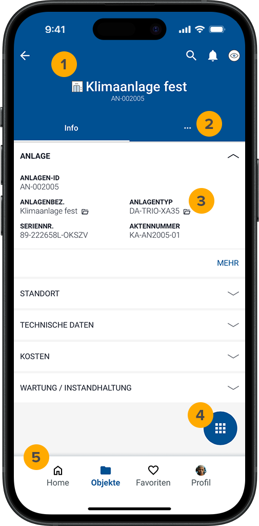 Standardmäßig öffnet sich eine Objektkarte im Ansichtsmodus. Dieser bietet die wichtigsten Informationen platzsparend auf einen Blick. Verfügen Karten über viele Felder, lassen sich diese in Bereichen bündeln und bei Bedarf auf- und zuklappen. Mit der Stift-Schaltfläche, die über das Action-Menü (siehe Punkt 4) aufrufbar ist, kann in den Bearbeitungsmodus gewechselt werden. Dort stehen bekannte Feld- und Katalogfunktionen zur Verfügung.