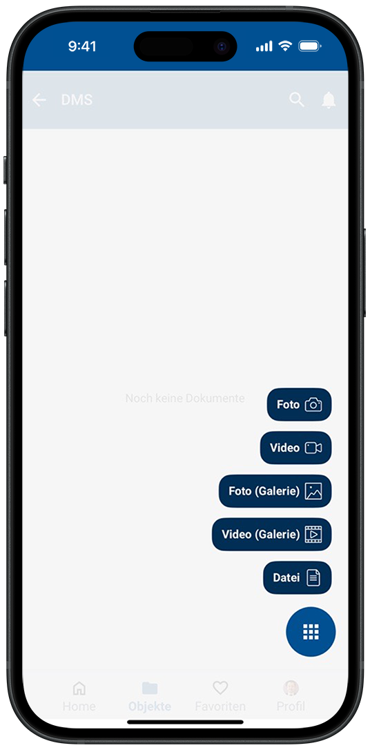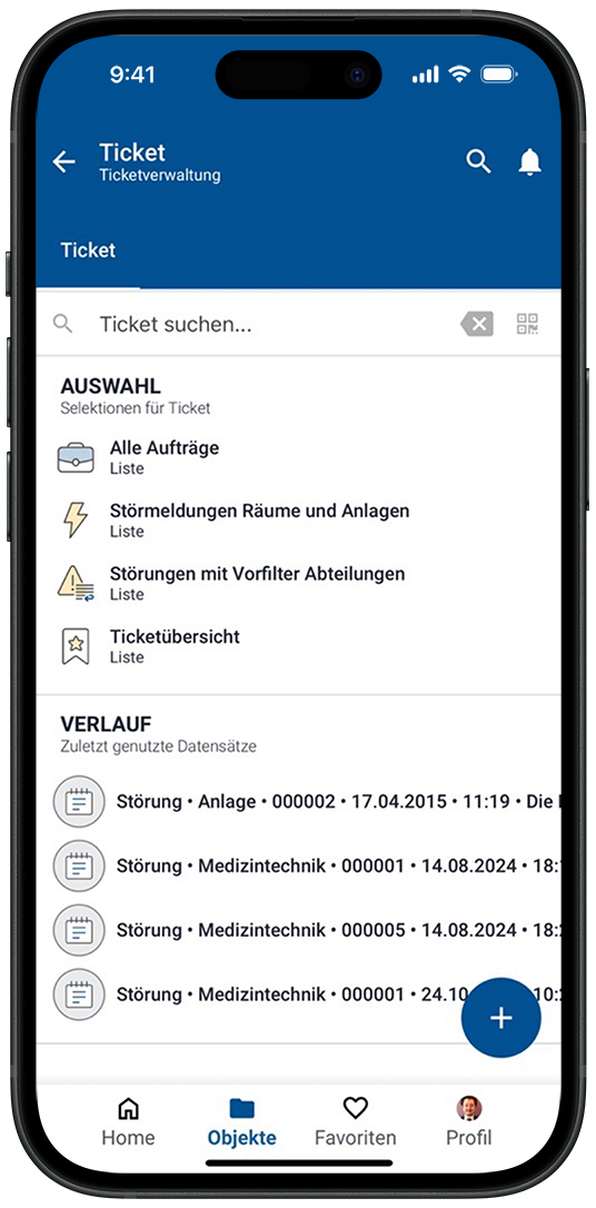 Auf dem Startbildschirm des mobilen Ticketsystems kann ein Objekt gesucht, gescannt oder neu erfasst werden. Listen bieten einen individuellen Schnellzugriff.