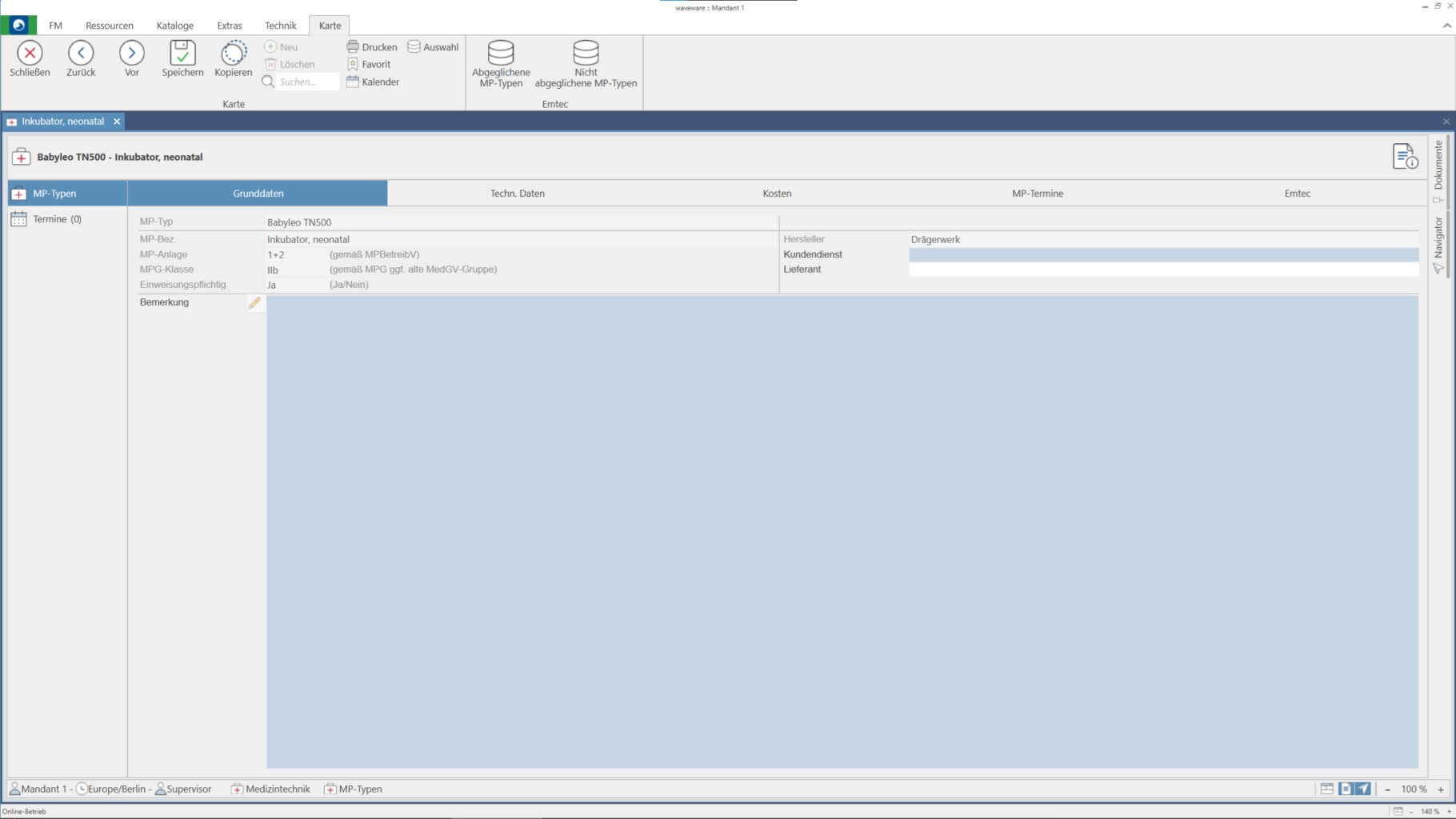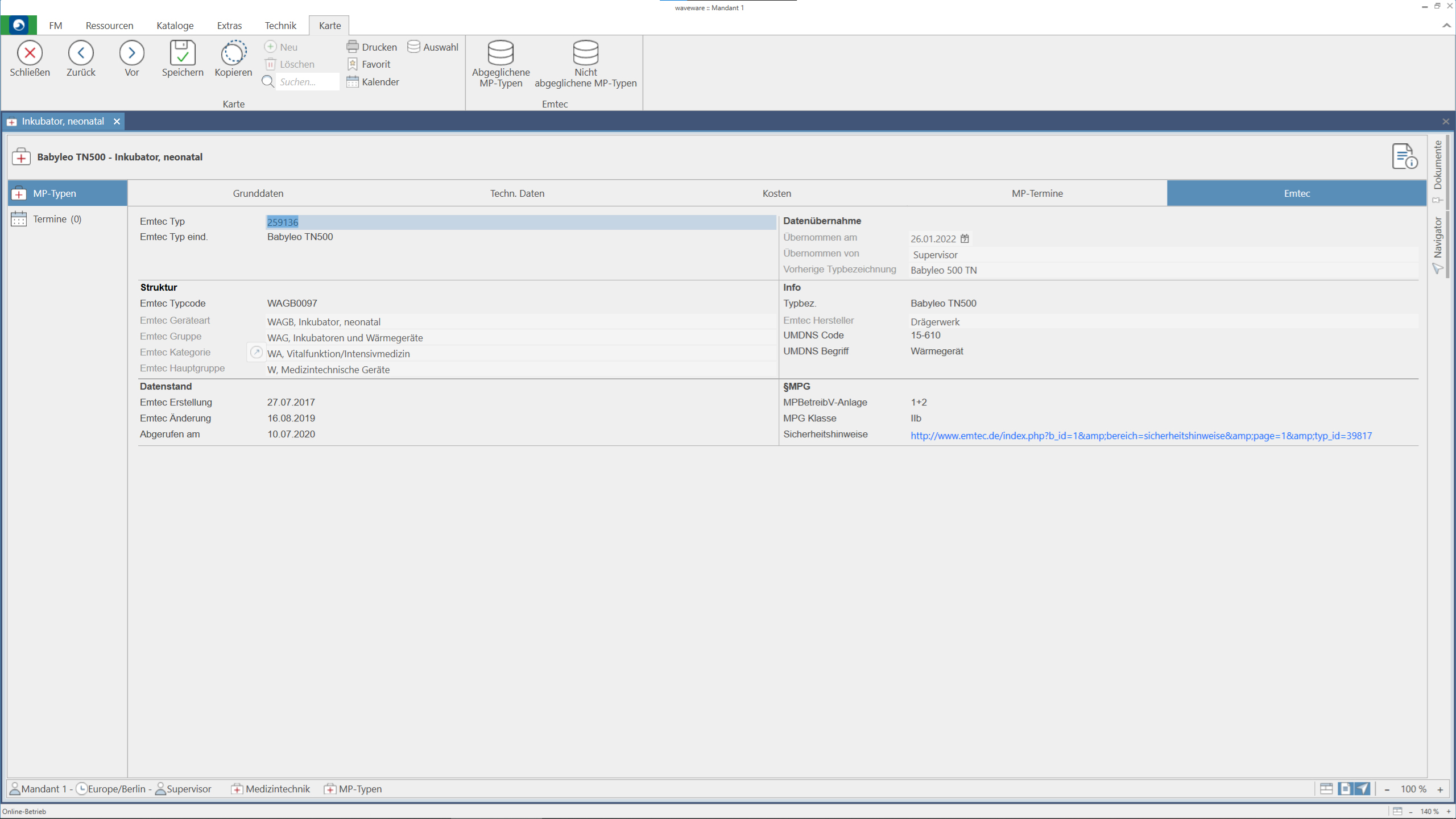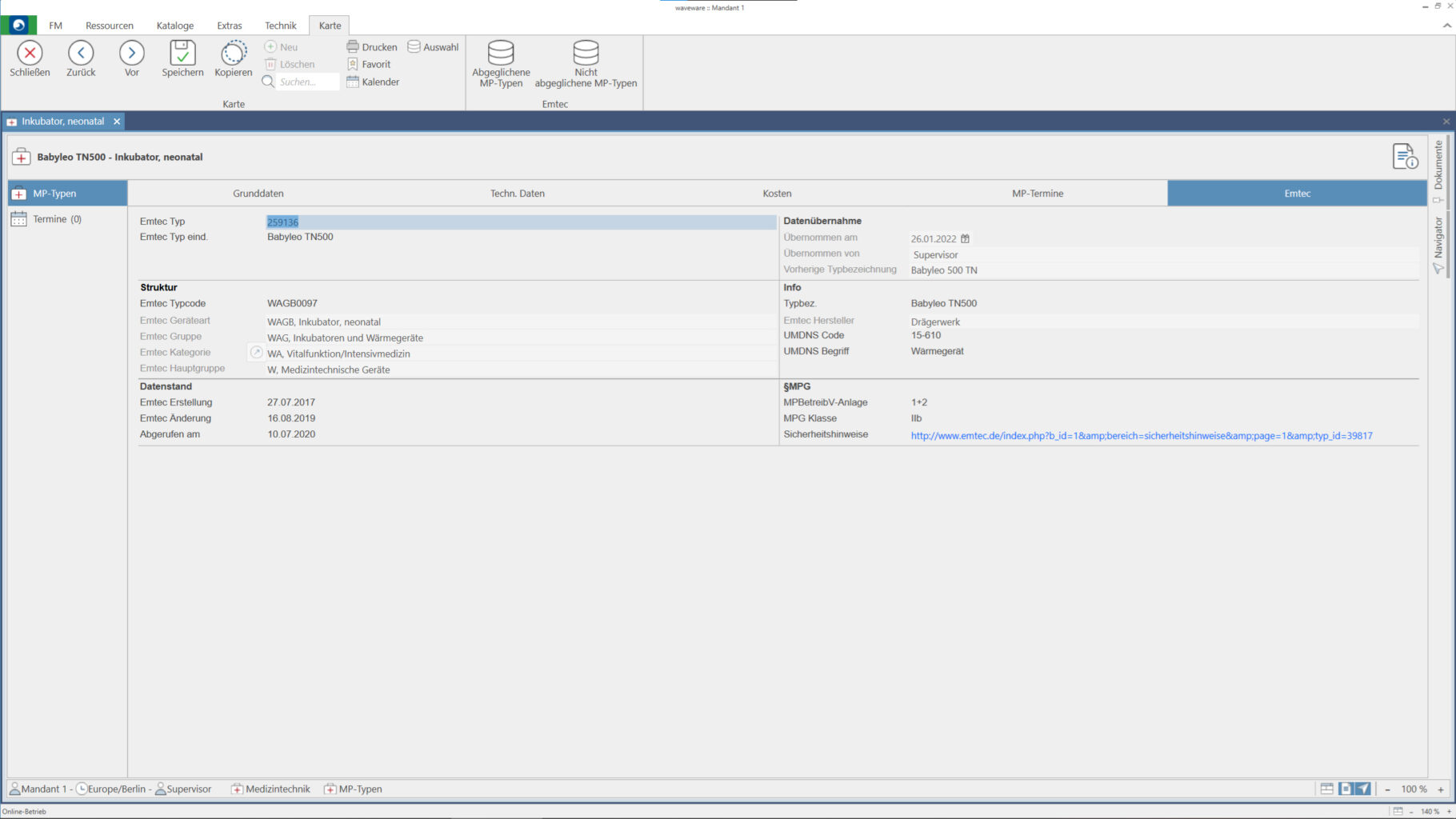 Wenn Sie einen neuen Medizinprodukte-Typen (MP-Typen) anlegen möchten, unterstützt Sie die emtec-Schnittstelle optimal für eine leichtgängige Verknüpfung mit dem jeweiligen emtec-Katalog. Optional ruft EMTEC MEDICAL im Zusammenspiel mit der Medizintechnikverwaltung MED Informationen zu Prüfungen und Kontrollen ab und legt automatisiert entsprechende Termine am medizintechnischen Gerät an.