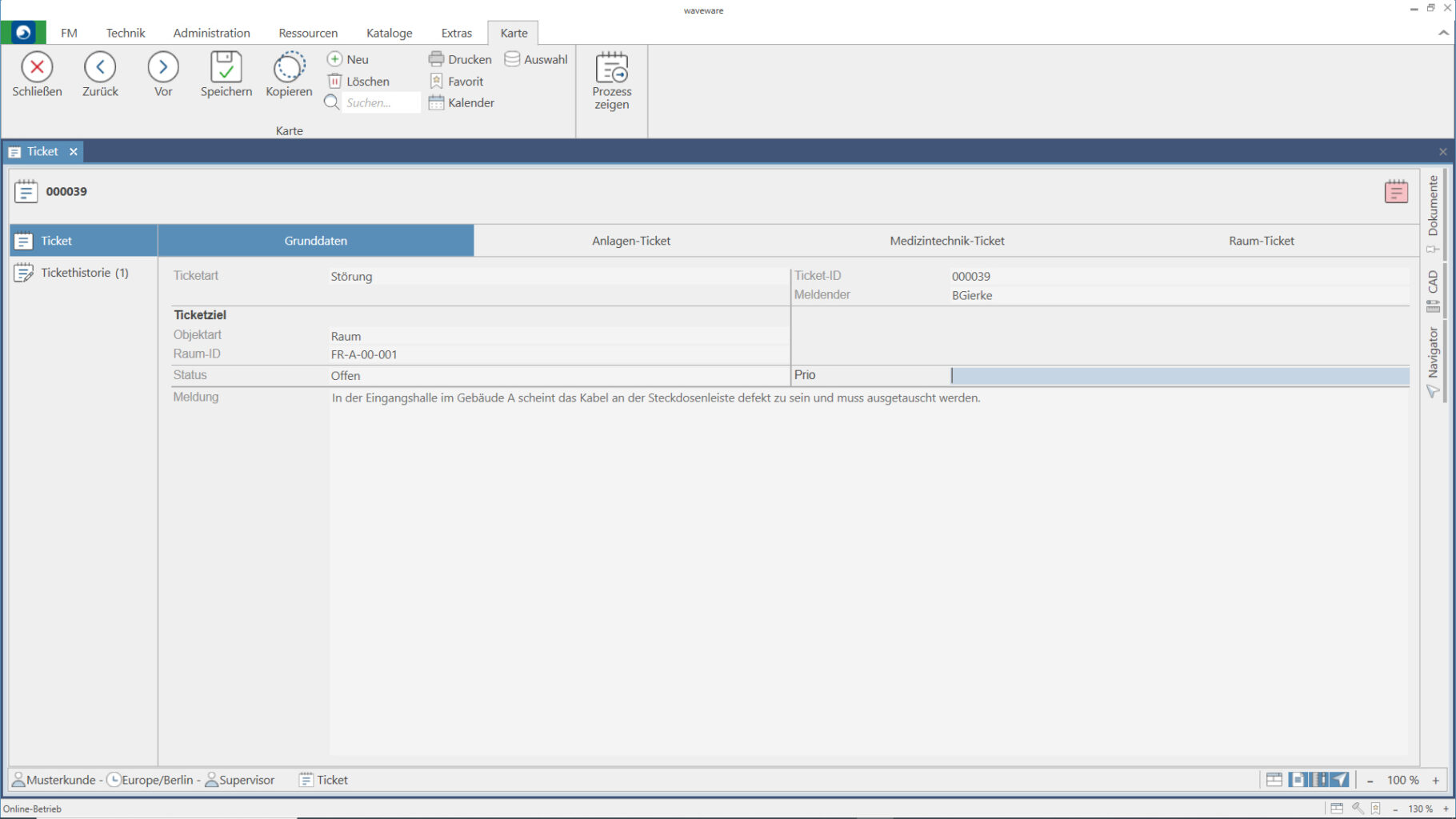 Der Anwendungs-Client waveware® NETPROCESS bringt spezifische Prozesse von wave Facilities ins Web. Dazu verbindet waveware® NETPROCESS die Nutzung leistungsstarker Funktionen der CAFM-Software wave Facilites wie das Ticketsystem mit dem Komfort einer übersichtlichen und intuitiven Web-Eingabemaske. So können neue Tickets in Sekunden über eine leicht bedienbare Weboberfläche erstellt und im System weiterverarbeitet werden. Die Übersichtsliste zeigt alle offenen Tickets inklusive dem jeweiligen Bearbeitungsstatus an. Weiterhin können die in waveware® NETPROCESS angebotenen Funktionen unabhängig vom Standort und von beliebig vielen Anwendern gleichzeitig genutzt werden. Für die Eingabe und Anzeige von Störmeldungen und Anforderungen ist keine weitere Installation der Software notwendig. Die Schnittstelle zur Datenbank der CAFM-Software wave Facilities ermöglicht viele Hintergrund-Datenbankabfragen, Statusanzeigen und umfangreiche Katalogfunktionen.