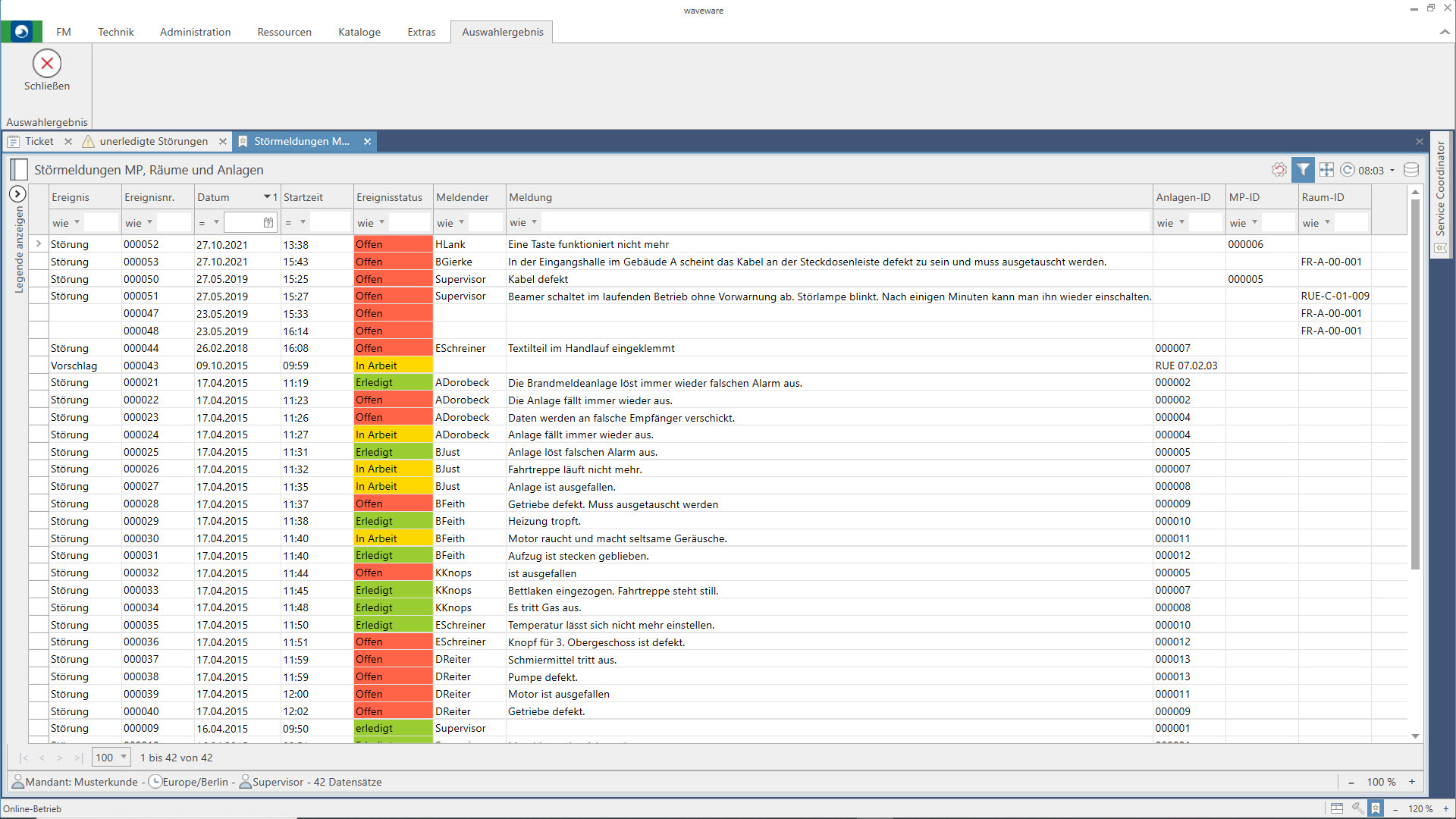 Die Anwendung TICKET ergänzt die Instandhaltungssoftware um ein vollintegriertes Ticketmanagementsystem. Mit einer Störmeldung können bei der Eingabe sämtliche Objekte verknüpft werden. Der Empfänger sieht sofort, in welchem Gebäude, Stockwerk, Raum die Störung zu finden ist und um welche Art von Störung es sich handelt. Über die Oberfläche des Ticketsystems lassen sich alle offenen Tickets und der dazugehörige Status anzeigen. Wer welche Daten einsehen kann, wird über eine Rechteverwaltung geregelt. Eingegebene Tickets können jederzeit umfänglich ausgewertet werden. So wird beispielsweise schnell ersichtlich, wenn ein Gerät oder eine Maschine besonders unzuverlässig arbeitet und ausgewechselt werden sollte. Die ausgewerteten Daten bilden somit eine Grundlage für technische und wirtschaftliche Entscheidungen.