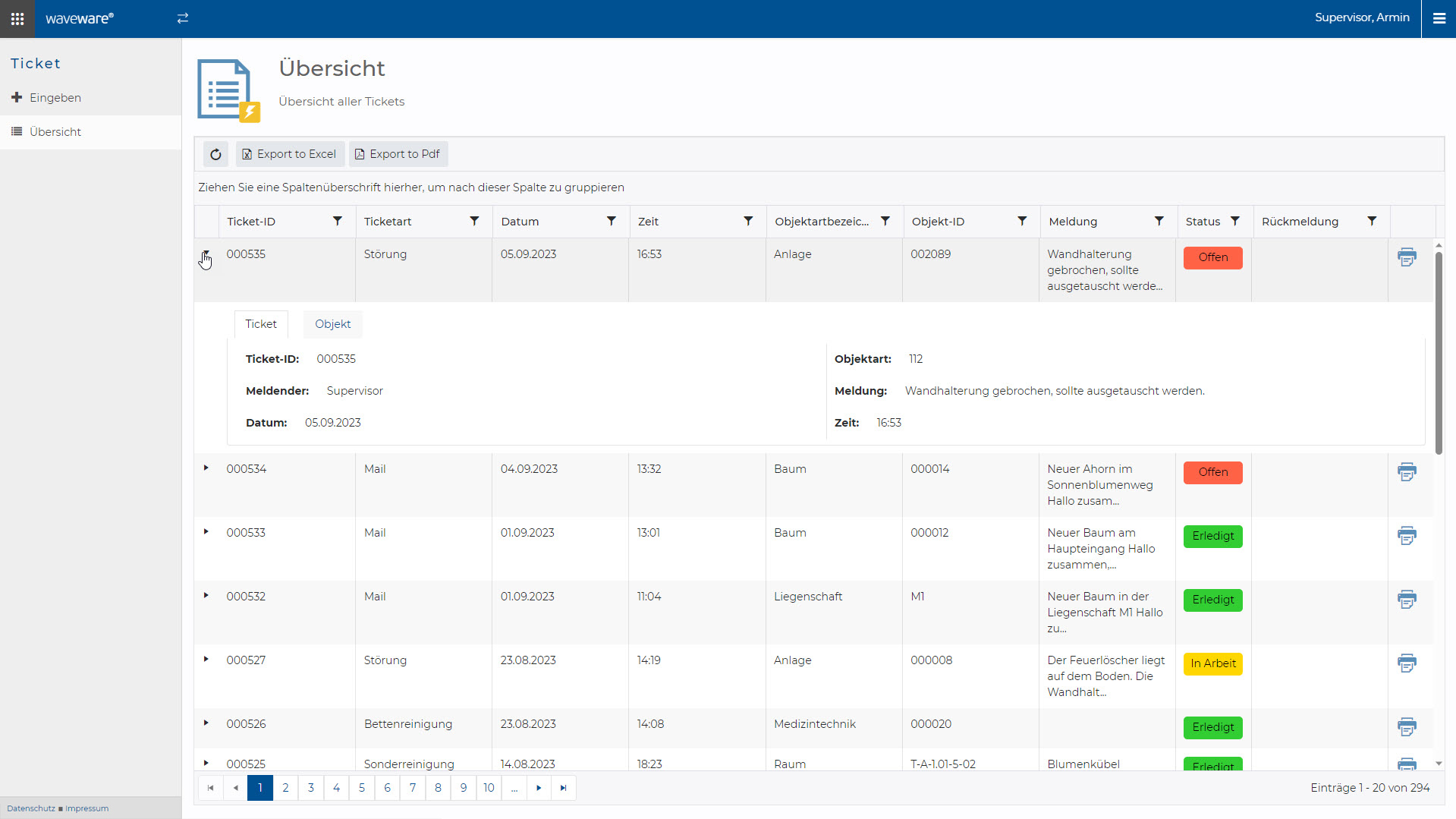 Das Service-Portal waveware® NETPROCESS kann für kundenindividuelle Anforderungen, wie z.B. die dezentrale Nutzung eines Ticketsystems, eingesetzt werden. Hierdurch ist es in einem Kundenunternehmen möglich, von jedem beliebigen Rechner Tickets über eine übersichtliche Eingabemaske einzugeben. Tickets werden genutzt, um Störmeldungen und Anforderungen aller Art, wie z.B. eine defekte Lampe, eine Support-Anfrage, eine Fahrzeugreservierung oder eine Visitenkartenbestellung, über ein zentrales Tool an die zuständige Stelle weiterzuleiten. Anschließend leitet das Ticketsystem spezifische Folgeprozesse ein und gibt Rückmeldungen über den Bearbeitungsstand des jeweiligen Tickets. In einer übersichtlichen Liste werden alle Tickets und deren aktueller Status aufgelistet.