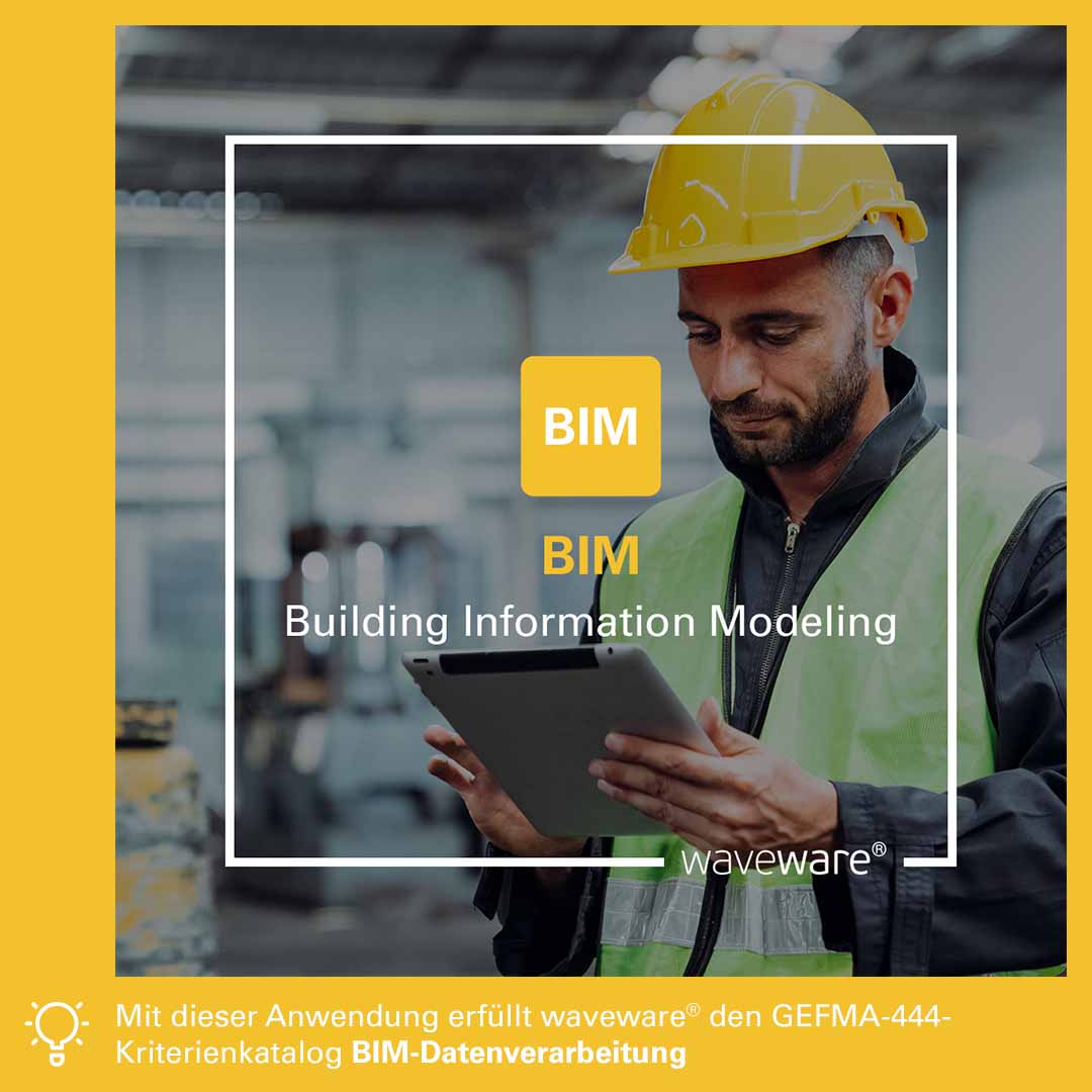 BIM im CAFM effizient einsetzen: Die bidirektionale BIM-Schnittstelle von waveware® unterstützt die Planung, Ausführung und Bewirtschaftung von Gebäuden. Der sogenannte digitale Zwilling des BIM-Modells lässt sich per ifc- oder Revit-Datei in waveware® importieren. Über die bidirektionale Schnittstelle lassen sich in der CAFM-Software geänderte Daten an die BIM-Modelle zurückgegeben. Die Datenbasis eignet sich für Prognosen und Simulationen über den gesamten Lebenszyklus eines Bauwerks hinweg. Beispielsweise lässt sich in einer kennzahlengestützten Simulation sehr schnell feststellen, ob Baumaßnahmen (z.B. bei dem Einsatz großflächiger Glasflächen) ungeahnte Folgekosten durch Wartung und Reinigung in Millionenhöhe verursachen. Die waveware® BIM-Schnittstelle erfüllt den GEFMA-444-Kriterienkatalog BIM-Datenverarbeitung.