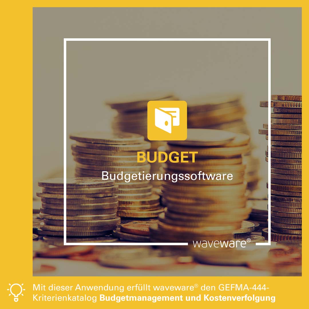 BUDGET ermöglicht die effiziente Verwaltung und Kontrolle von Budgets und unterstützt dadurch den betriebswirtschaftlichen Planungsprozess: Finanzielle Planungssicherheit: Klare Budgetzuweisung ermöglicht präzise Planung und Budgetierung; Kostenkontrolle: BUDGET hilft, Ausgaben zu begrenzen und frühzeitig gegen Überschreitungen vorzugehen; Effiziente Ressourcennutzung: Zielgerichtete Budgetverteilung optimiert den Ressourceneinsatz und die Prioritätensetzung; Transparente Dokumentation: Alle Ausgaben werden nachvollziehbar erfasst und erleichtern die Analyse der finanziellen Performance; Compliance und Reporting: Lückenlose Dokumentation unterstützt die Einhaltung von Richtlinien und erleichtert die Berichterstattung. BUDGET sorgt dafür, dass finanzielle Ressourcen effizient genutzt werden und stets ein vollständiger Überblick über die Ausgaben besteht – ein entscheidender Vorteil für eine strategische Budgetplanung. Damit erfüllt BUDGET den GEFMA-444-Kriterienkatalog Budgetmanagement und Kostenverfolgung.
