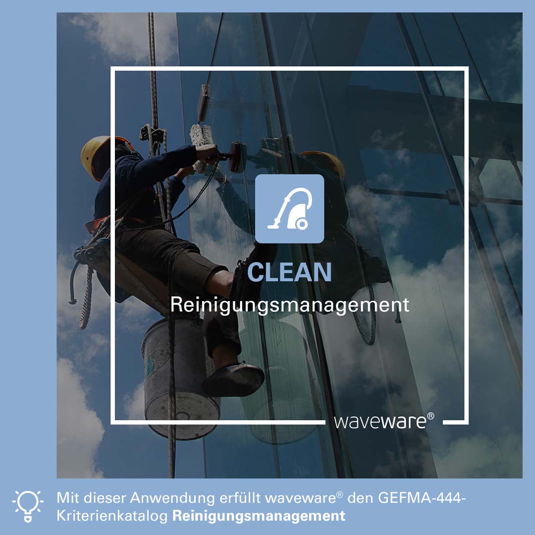 Gebäude und Liegenschaften in perfektem Glanz erstrahlen lassen: Hierfür ist das richtige Reinigungsmanagement essenziell. Die waveware® Anwendung CLEAN sorgt für die transparente Planung, Kostenüberwachung und Qualitätskontrolle aller Reinigungsleistungen – für ein makelloses Finish sowie eine beständige Werterhaltung. Mit der optionalen Nutzung per waveware® MOBILE 2 App stehen alle benötigten Daten auf dem Smartphone oder Tablet bereit. Aufträge zur Qualitätssicherung können so direkt vor Ort abgearbeitet werden. Damit erfüllt CLEAN alle Anforderungen des GEFMA-444-Kriterienkatalogs Reinigungsmanagement.