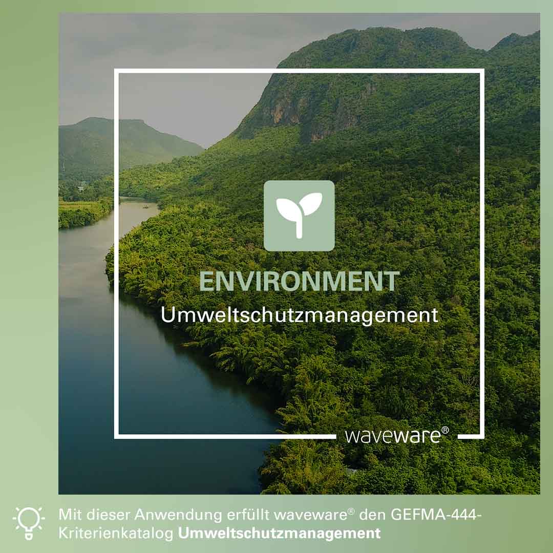 Effizientes Umweltschutzmanagement erfordert eine zuverlässige Dokumentation – sei es für interne Analysen, Nachhaltigkeitsstrategien oder behördliche Kontrollen. Unsere GEFMA-444-zertifizierte Anwendung ENVIRONMENT sorgt für Transparenz und unterstützt Unternehmen mit diversen Funktionen dabei, ihren ökologischen Fußabdruck zu optimieren sowie gesetzliche Anforderungen zuverlässig einzuhalten: Erfassung von Emissionswerten, Erstellung von Nachweisen entsorgter Abfallstoffe gemäß Abfallnachweisverordnung, Erfassung von Einleitungen in Gewässer, Erstellung und Zuordnung von Begleitpapieren zur Stoffdeklaration für die Entsorgung, Vergleich verschiedener Objekte anhand von Umweltkennzahlen, Erstellung von Abfallbilanzen. Damit erfüllt ENVIRONMENT den GEFMA-444-Kriterienkatalog Umweltschutzmanagement.