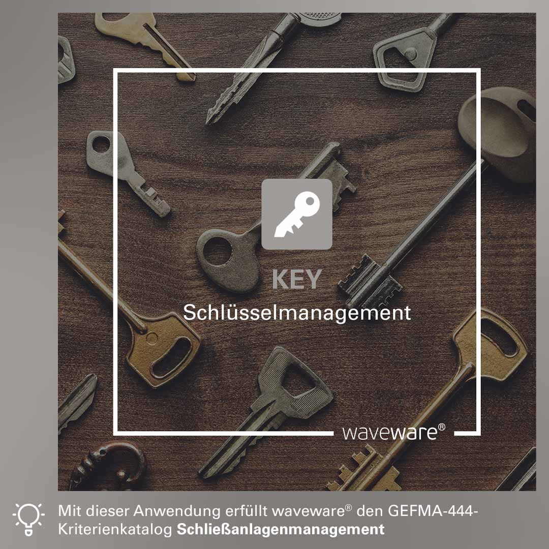 Sicherheit, Kontrolle und Übersichtlichkeit im Schließanlagenmanagement: Mit KEY erfüllt waveware® die Anforderungen des GEFMA-444-Kriterienkatalogs Schließanlagenmanagement. Die Schlüsselmanagementsoftware umfasst eine integrierte Personalverwaltung, ein ausgeklügeltes Rollen- und Rechtekonzept sowie umfassende Auswertungsmöglichkeiten. Die Ausgabe von Schlüsseln an interne und externe Personen kann mit unterschiedlichen Zugangsberechtigungen effektiv verwaltet werden. Damit erfüllt KEY alle Anforderungen des GEFMA-444-Kriterienkatalogs Schließanlagenmanagement.