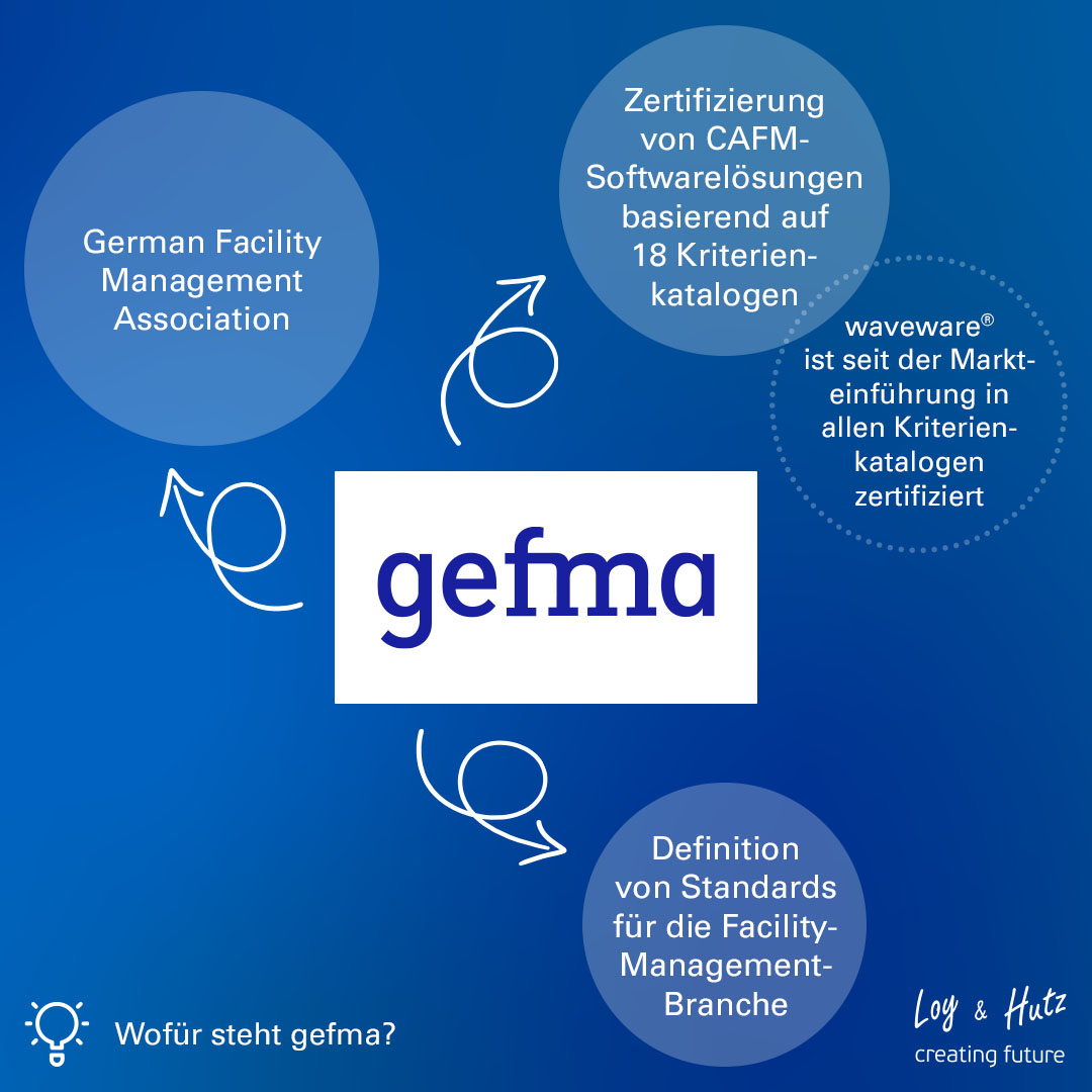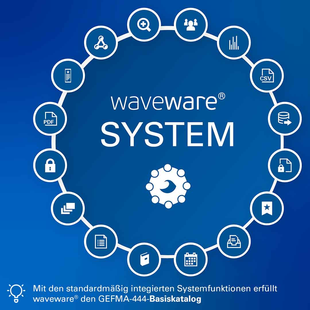German Facility Management Association – kurz gefma – ist der Deutsche Verband für Facility Management e.V. Der 1989 gegründete Branchenverband hat mittlerweile mehr als 1.000 Mitglieder. Basierend auf 18 Kriterienkatalogen zertifiziert die GEFMA-Richtlinie 444 CAFM-Softwarelösungen. Jeder Kriterienkatalog definiert die Anforderungen an eine CAFM-Software in einem bestimmten Anwendungsbereich. Seit der Markteinführung ist waveware® durchgehend in allen Kriterienkatalogen erfolgreich zertifiziert. Zudem bietet die Softwareplattform über 80 weitere Anwendungen für unterschiedliche Einsatzbereiche.
