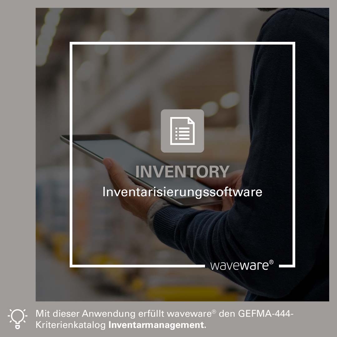 Wie behält man stets den Überblick über das vorhandene Inventar im Unternehmen? Ganz einfach mit waveware® INVENTORY. In die Inventarisierungssoftware lassen sich Räume, Ausstattungen, Anlagen und vieles mehr mit wenigen Klicks aus vorhandenen Inventarlisten oder CAD-Plänen importieren. Anhand dieser Daten erfolgt die effiziente Planung und Durchführung von Inventuren. Neben der Bestandserfassung und Standortbestimmung bietet INVENTORY die Möglichkeit, den Objektzustand bereits während der Inventur zu bewerten. Mit der waveware® MOBILE 2 App können alle Facilities schnell und einfach per Bar-/QR-Code-Scan erfasst und deren Zustand bewertet werden. Dabei ist zu jeder Zeit sowohl die Einhaltung aller rechtlichen Belange im Rahmen der Inventur-Pflicht gewährleistet als auch eine detaillierte Auswertung und Analyse der erfassten Daten möglich. Damit erfüllt INVENTORY den GEFMA-444-Kriterienkatalog Inventarmanagement.