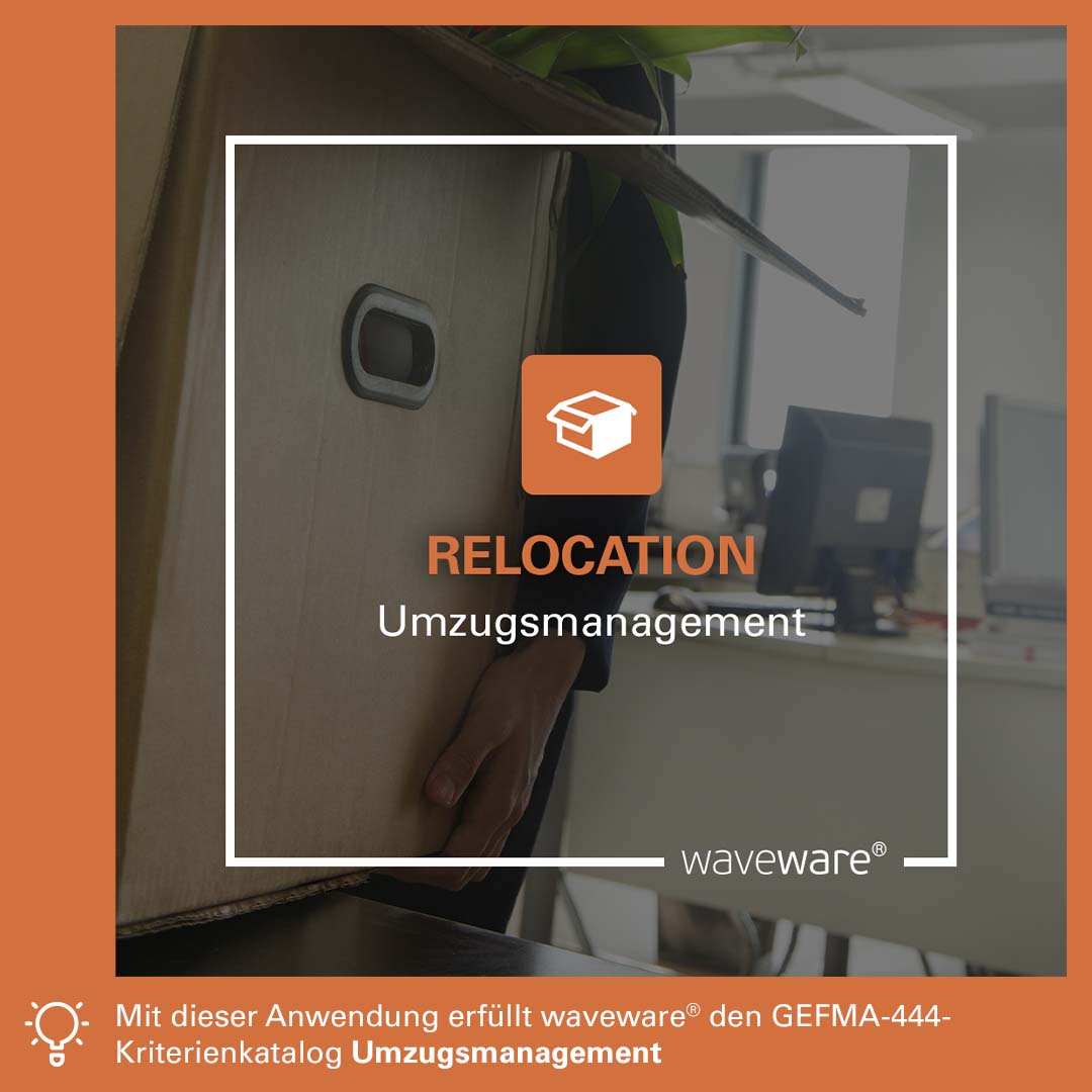 Packen Sie die Kartons und meistern Sie betriebliche Umzüge mühelos mit der waveware® Umzugsmanagement-Software RELOCATION! Dank ihr lassen sich Umzüge effizient planen, freigeben und bewerten. Das Umzugsmanagement nutzt die bestehende FM-Struktur mit allen Liegenschaften, Gebäuden, Geschossen, Räumen und Flächen, sodass sich Teil- und Gesamtumzüge mit wenigen Angaben vorbereiten lassen. Nach erfolgreichem Abschluss des Umzugs werden alle Raumzuordnungen in waveware® automatisch aktualisiert. Optional ist eine CAD-Anbindung möglich. Damit erfüllt RELOCATION den GEFMA-444-Kriterienkatalog Umzugsmanagement.