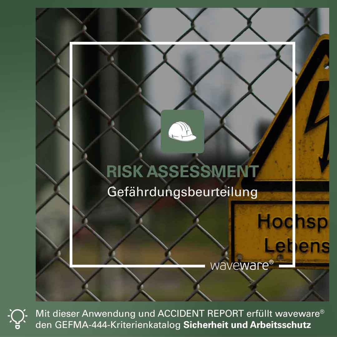 Der GEFMA-444-Kriterienkatalog Sicherheit und Arbeitsschutz definiert wichtige Grundlagen für die Beurteilung von Gefährdungen am Arbeitsplatz. Mit den Anwendungen RISK ASSESSMENT (Gefährdungsbeurteilung) und ACCIDENT REPORT (Verbandbuch) erfüllt waveware® alle Kriterien. Somit tragen sie zur reibungslosen Umsetzung des verpflichtenden Arbeitsschutzgesetzes bei. Beispielsweise wird die Ableitung von Schutzmaßnahmen, die grafische Darstellung von Gefährdungspotenzialen oder die Erfassung sicherheitsrelevanter Objekte gewährleistet. Damit erfüllen RISK ASSESSMENT und ACCIDENT REPORT den GEFMA-444-Kriterienkatalog Sicherheit und Arbeitsschutz.