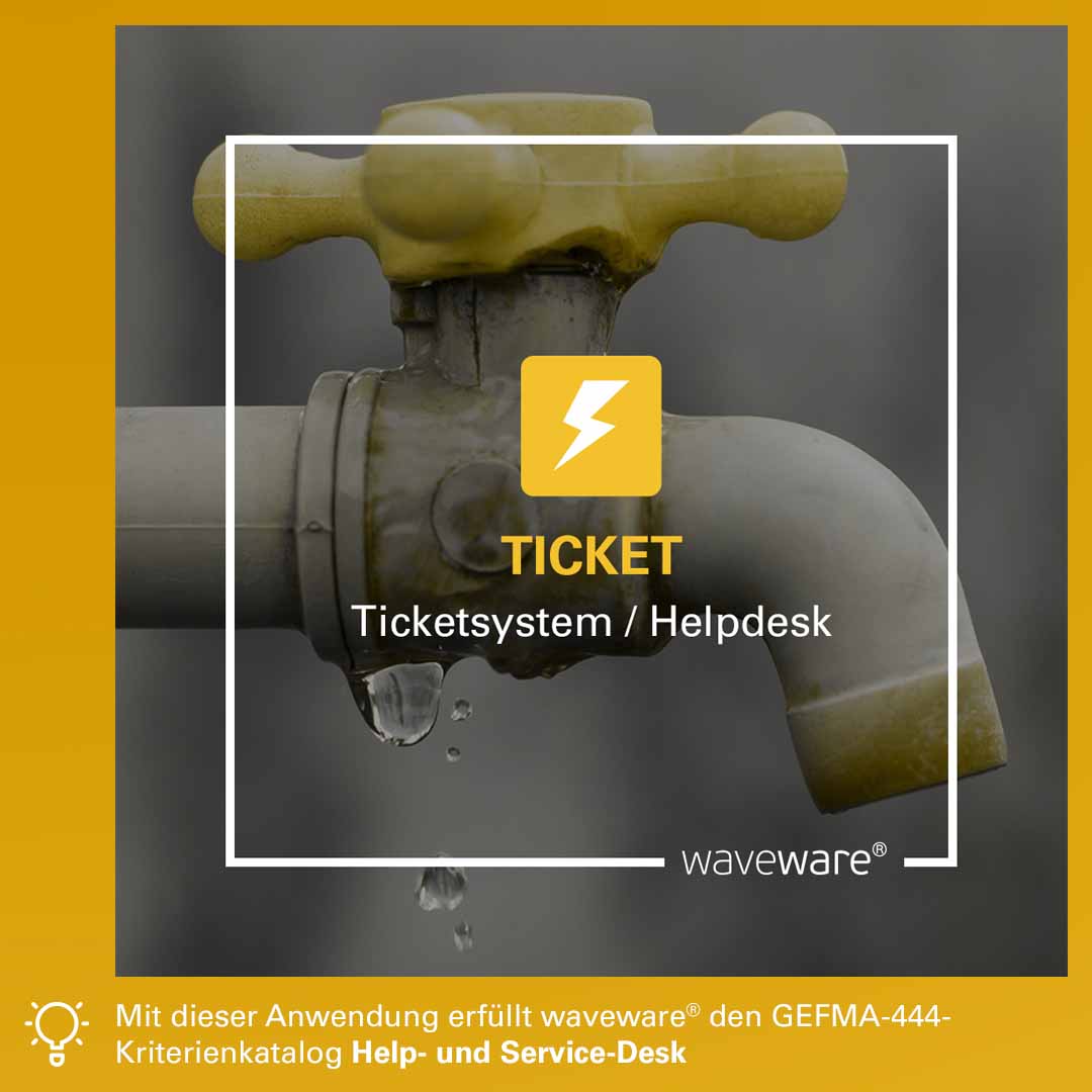 Die Klimaanlage ist defekt? Ein Leuchtmittel fehlt? Arbeitsmaterial muss nachbestellt werden? Kein Problem. Mit dem waveware® Ticketsystem TICKET können Störmeldungen und Anforderungen jeglicher Art in wenigen Schritten erfasst werden. Per App lässt sich direkt ein Foto des defekten Geräts an das Ticket anhängen. Der Bearbeitungsstand eines Tickets kann jederzeit zentral eingesehen und nachvollzogen werden. Dabei erfüllt TICKET alle Anforderungen des GEFMA-444-Kriterienkatalogs Help- und Service-Desk.