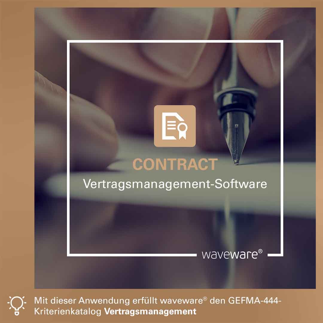 Verträge, Laufzeiten und Fristen immer im Blick: Die Vertragsmanagement-Software CONTRACT ermöglicht die Erfassung von Daten wie Vertragstyp, Vertragslaufzeit und Vertragsgegenstand. Zudem können Dokumente wie Berichte verknüpft werden. Umfangreiche Auswertungen und Listen sorgen für einen besseren Überblick über alle Verträge. Diese lassen sich z.B. nach ihrem Status (Angebot, aktiv, gekündigt, beendet) sortieren und filtern. Mit CONTRACT erfüllt waveware® den GEFMA-444-Kriterienkatalog Vertragsmanagement.