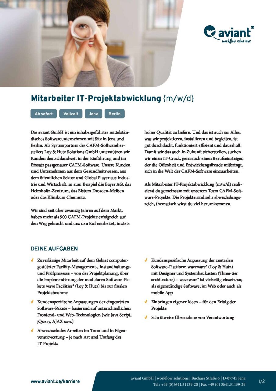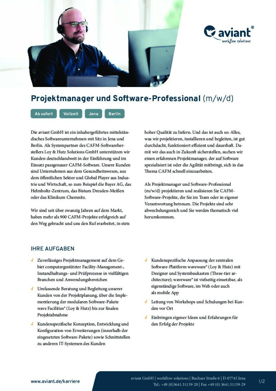 Die aviant GmbH ist seit über 20 Jahren Partner von Loy & Hutz und waveware® Implementierer in den Bereichen CAFM, FM, Instandhaltung und Medizintechnik. Neben tiefgehenden Know-how über alle waveware® Prozesse hinweg, bietet aviant eigene Softwarelösungen an. Darunter fallen die Konferenzraumverwaltung, die Zutrittsgenehmigung und weitere – auf der waveware® Plattform basierende – Softwarepakete.
