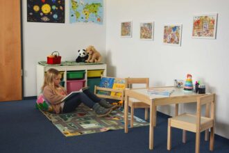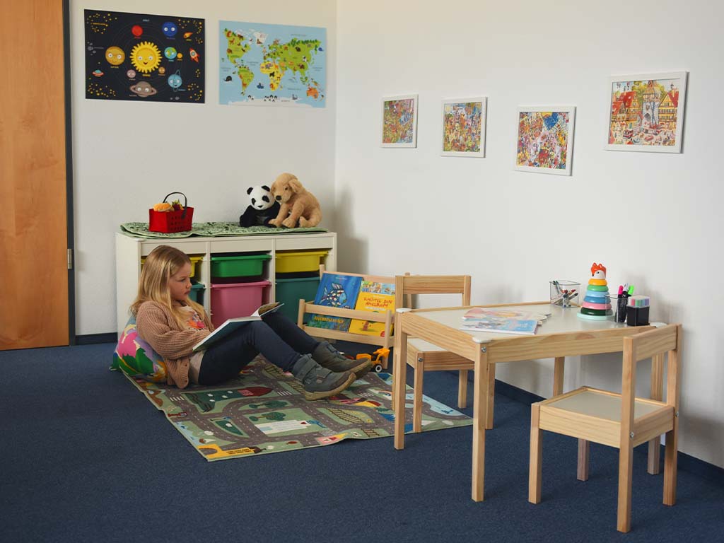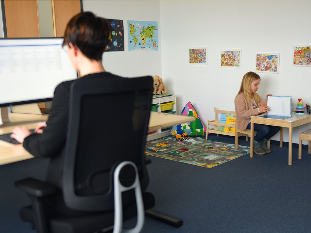 Egal ob Kita-Streik, kurzfristige Absage der Tagesbetreuung oder Unterrichtsausfall – unser Eltern-Kind-Büro im Standort Freiburg ermöglicht produktives Arbeiten und ist gleichzeitig ein kindgerecht eingerichteter Raum, um Zeit im Büro zu überbrücken. Mit Kinderschreibtisch und Spielecke ausgestattet können Kinder jeden Alters ihre Hausaufgaben machen, lesen, malen oder spielen, während Mama oder Papa am voll ausgestatteten Arbeitsplatz arbeitet.