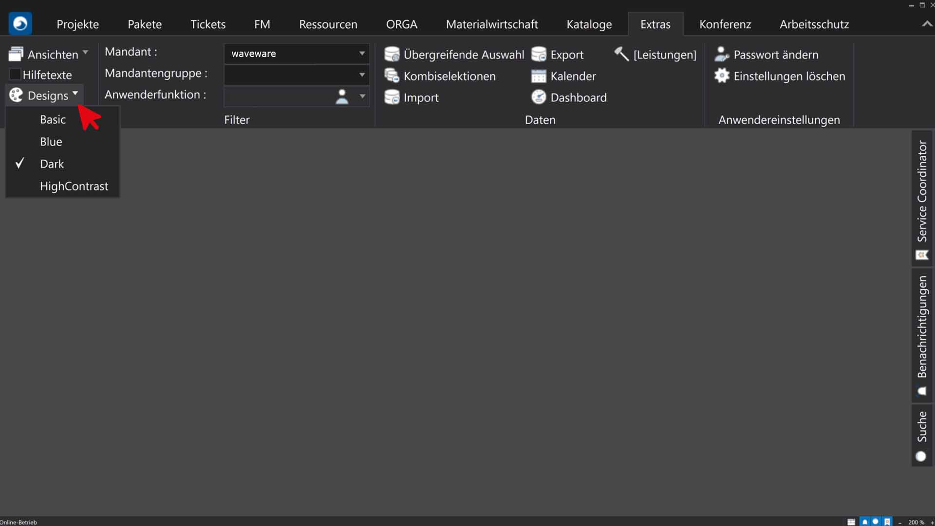 Schon gewusst? Für waveware® gibt es nicht nur den hellen Basic Mode, sondern auch einen schicken Dark Mode, der nicht nur zu dunklen Tageszeiten von manchen Usern als angenehmer für die Augen empfunden wird. Er kann ganz einfach im Windows-Client eingestellt werden. Hierfür auf Extras klicken und dort unter Designs „Dark“ auswählen.