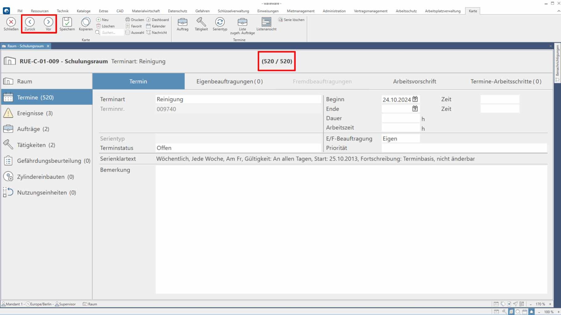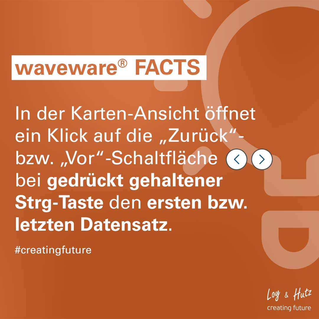 Schon gewusst? In der Karten-Ansicht öffnet ein Klick auf die „Zurück“- bzw. „Vor“-Schaltfläche bei gedrückt gehaltener Strg-Taste den ersten bzw. letzten Datensatz. Das funktioniert sowohl im waveware® Web- als auch im Windows-Client. Ein einfacher Klick auf „Zurück“ oder „Vor“ öffnet wie gewohnt den vorherigen bzw. nachfolgenden Datensatz.